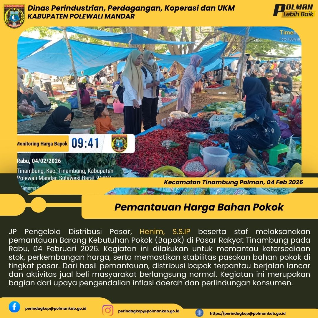 JP Pengelola Distribusi Pasar, Henim, S.S.IP beserta staf melaksanakan pemantauan Barang Kebutuhan Pokok (Bapok) di Pasar Rakyat Tinambung pada Rabu, 04 Februari 2026. Kegiatan ini dilakukan untuk memantau ketersediaan stok, perkembangan harga, serta memastikan stabilitas pasokan bahan pokok di tingkat pasar. Dari hasil pemantauan, distribusi bapok terpantau berjalan lancar dan aktivitas jual beli masyarakat berlangsung normal. Kegiatan ini merupakan bagian dari upaya pengendalian inflasi daerah...