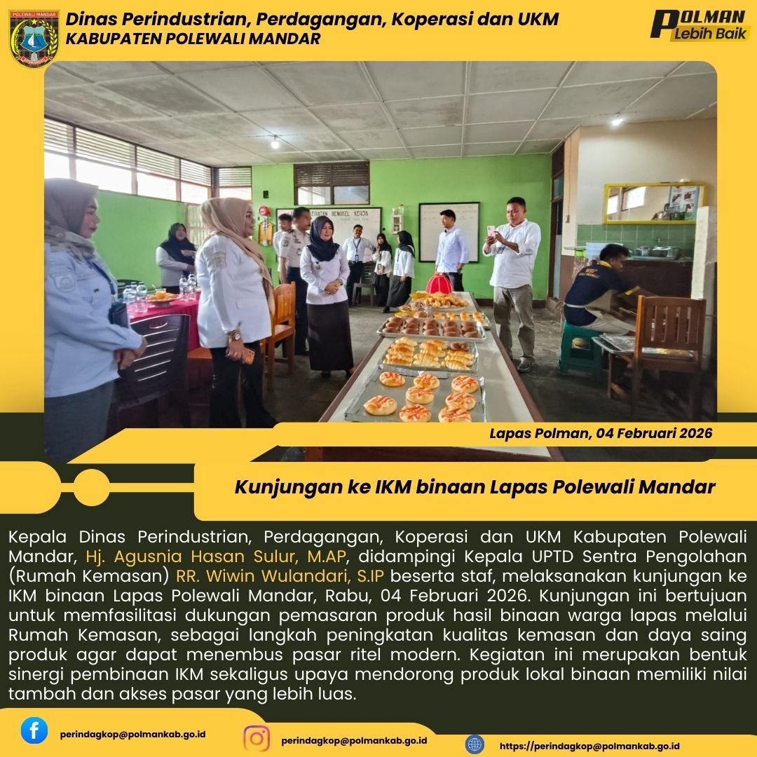 Kepala Dinas Perindustrian, Perdagangan, Koperasi dan UKM Kabupaten Polewali Mandar, Hj. Agusnia Hasan Sulur, M.AP, didampingi Kepala UPTD Sentra Pengolahan (Rumah Kemasan) RR. Wiwin Wulandari, S.IP beserta staf, melaksanakan kunjungan ke IKM binaan Lapas Polewali Mandar, Rabu, 04 Februari 2026. Kunjungan ini bertujuan untuk memfasilitasi dukungan pemasaran produk hasil binaan warga lapas melalui Rumah Kemasan, sebagai langkah peningkatan kualitas kemasan dan daya saing produk agar dapat menembu...