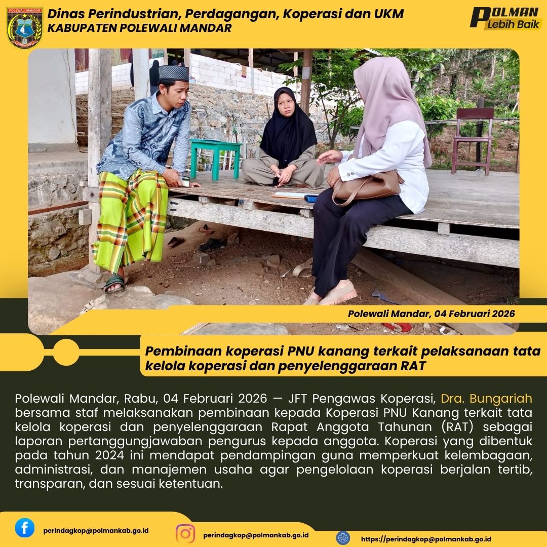 Polewali Mandar, Rabu, 04 Februari 2026 — JFT Pengawas Koperasi, Dra. Bungariah bersama staf melaksanakan pembinaan kepada Koperasi PNU Kanang terkait tata kelola koperasi dan penyelenggaraan Rapat Anggota Tahunan (RAT) sebagai laporan pertanggungjawaban pengurus kepada anggota. Koperasi yang dibentuk pada tahun 2024 ini mendapat pendampingan guna memperkuat kelembagaan, administrasi, dan manajemen usaha agar pengelolaan koperasi berjalan tertib, transparan, dan sesuai ketentuan....