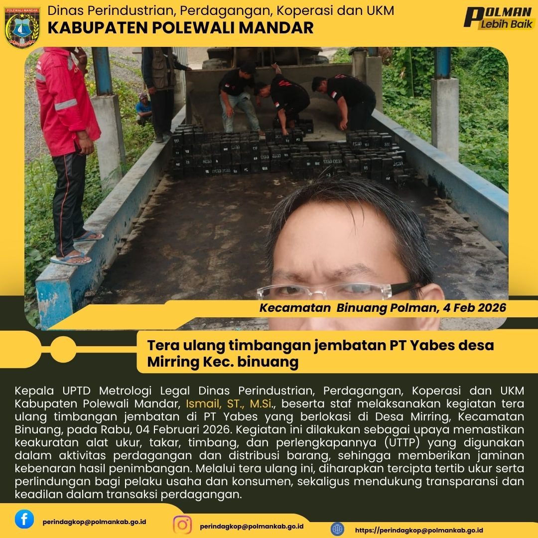 Kepala UPTD Metrologi Legal Dinas Perindustrian, Perdagangan, Koperasi dan UKM Kabupaten Polewali Mandar, Ismail, ST., M.Si., beserta staf melaksanakan kegiatan tera ulang timbangan jembatan di PT Yabes yang berlokasi di Desa Mirring, Kecamatan Binuang, pada Rabu, 04 Februari 2026. Kegiatan ini dilakukan sebagai upaya memastikan keakuratan alat ukur, takar, timbang, dan perlengkapannya (UTTP) yang digunakan dalam aktivitas perdagangan dan distribusi barang, sehingga memberikan jaminan kebenaran ...
