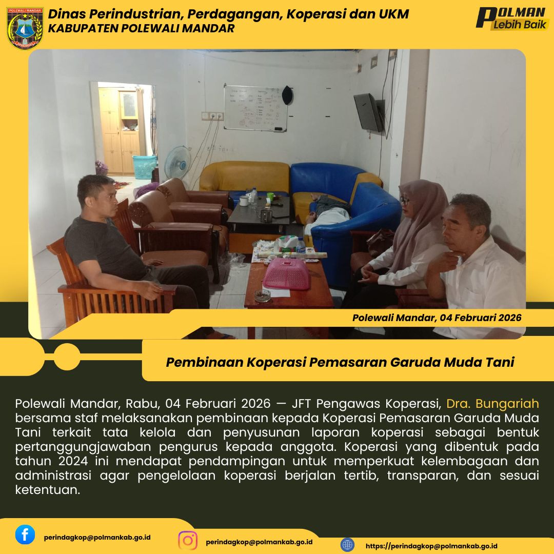 Polewali Mandar, Rabu, 04 Februari 2026 — JFT Pengawas Koperasi, Dra. Bungariah bersama staf melaksanakan pembinaan kepada Koperasi Pemasaran Garuda Muda Tani terkait tata kelola dan penyusunan laporan koperasi sebagai bentuk pertanggungjawaban pengurus kepada anggota. Koperasi yang dibentuk pada tahun 2024 ini mendapat pendampingan untuk memperkuat kelembagaan dan administrasi agar pengelolaan koperasi berjalan tertib, transparan, dan sesuai ketentuan....