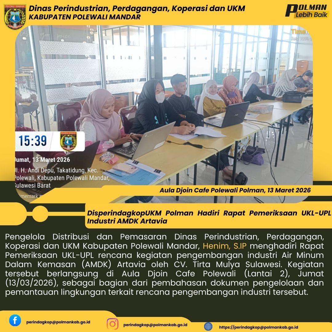 Pengelola Distribusi dan Pemasaran Dinas Perindustrian, Perdagangan, Koperasi dan UKM Kabupaten Polewali Mandar, Henim, S.IP menghadiri Rapat Pemeriksaan UKL-UPL rencana kegiatan pengembangan industri Air Minum Dalam Kemasan (AMDK) Artavia oleh CV. Tirta Mulya Sulawesi. Kegiatan tersebut berlangsung di Aula Djoin Cafe Polewali (Lantai 2), Jumat (13/03/2026), sebagai bagian dari pembahasan dokumen pengelolaan dan pemantauan lingkungan terkait rencana pengembangan industri tersebut....