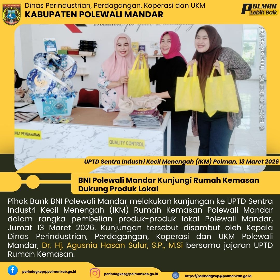 Pihak Bank BNI Polewali Mandar melakukan kunjungan ke UPTD Sentra Industri Kecil Menengah (IKM) Rumah Kemasan Polewali Mandar dalam rangka pembelian produk-produk lokal Polewali Mandar, Jumat 13 Maret 2026. Kunjungan tersebut disambut oleh Kepala Dinas Perindustrian, Perdagangan, Koperasi dan UKM Polewali Mandar, Dr. Hj. Agusnia Hasan Sulur, S.P., M.Si bersama jajaran UPTD Rumah Kemasan....