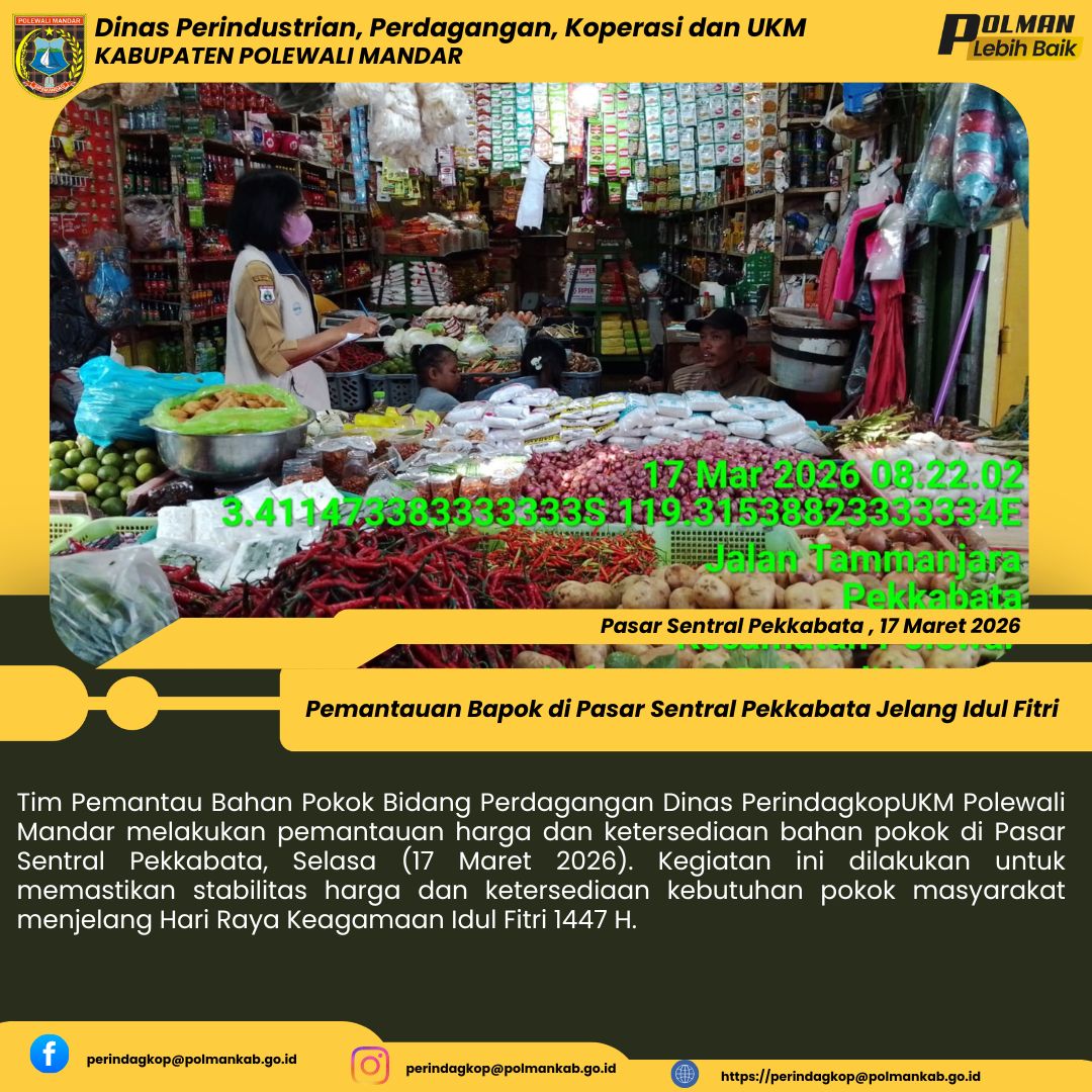 Tim Pemantau Bahan Pokok Bidang Perdagangan Dinas PerindagkopUKM Polewali Mandar melakukan pemantauan harga dan ketersediaan bahan pokok di Pasar Sentral Pekkabata, Selasa (17 Maret 2026). Kegiatan ini dilakukan untuk memastikan stabilitas harga dan ketersediaan kebutuhan pokok masyarakat menjelang Hari Raya Keagamaan Idul Fitri 1447 H....
