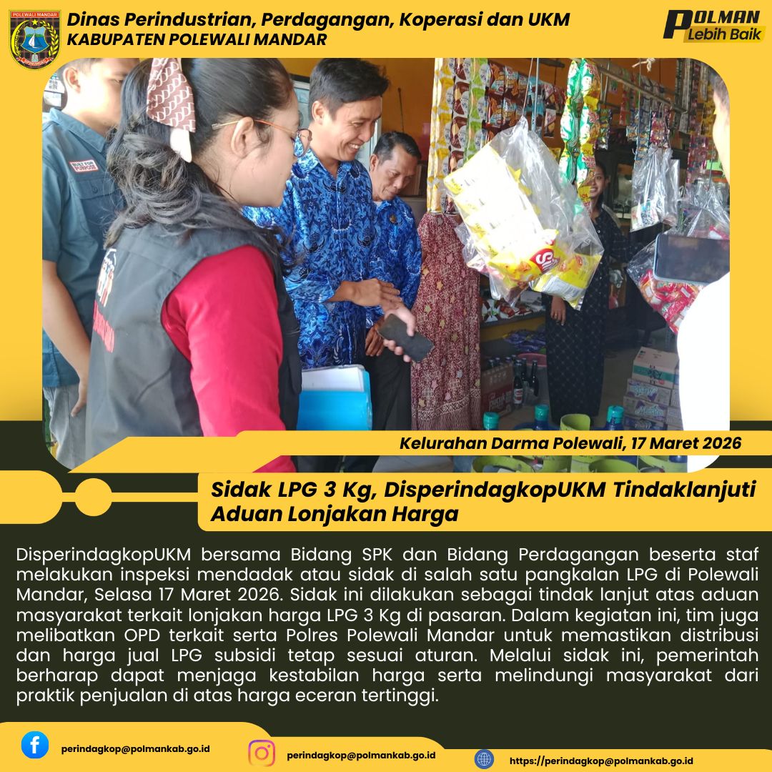 DisperindagkopUKM bersama Bidang SPK dan Bidang Perdagangan beserta staf melakukan inspeksi mendadak atau sidak di salah satu pangkalan LPG di Polewali Mandar, Selasa 17 Maret 2026. Sidak ini dilakukan sebagai tindak lanjut atas aduan masyarakat terkait lonjakan harga LPG 3 Kg di pasaran. Dalam kegiatan ini, tim juga melibatkan OPD terkait serta Polres Polewali Mandar untuk memastikan distribusi dan harga jual LPG subsidi tetap sesuai aturan. Melalui sidak ini, pemerintah berharap dapat menjaga ...