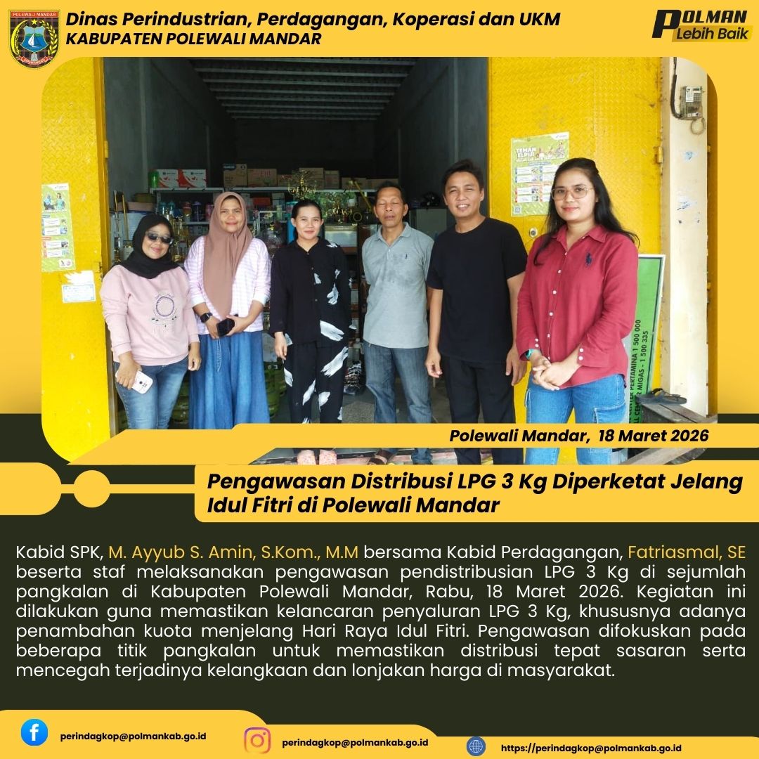 Kabid SPK, M. Ayyub S. Amin, S.Kom., M.M bersama Kabid Perdagangan, Fatriasmal, SE beserta staf melaksanakan pengawasan pendistribusian LPG 3 Kg di sejumlah pangkalan di Kabupaten Polewali Mandar, Rabu, 18 Maret 2026. Kegiatan ini dilakukan guna memastikan kelancaran penyaluran LPG 3 Kg, khususnya adanya penambahan kuota menjelang Hari Raya Idul Fitri. Pengawasan difokuskan pada beberapa titik pangkalan untuk memastikan distribusi tepat sasaran serta mencegah terjadinya kelangkaan dan lonjakan h...