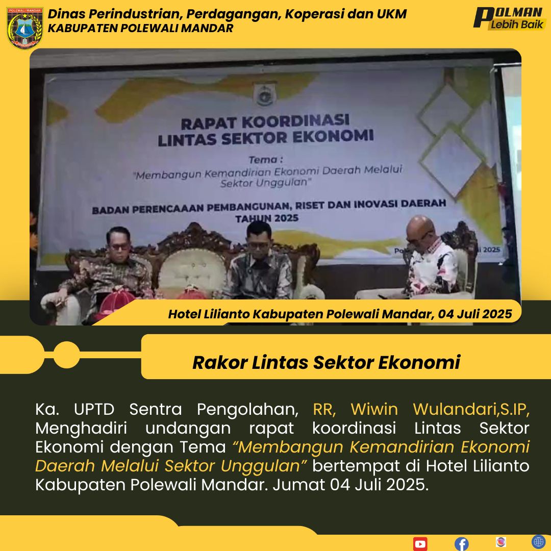Ka. UPTD Sentra Pengolahan, RR, Wiwin Wulandari,S.IP, Menghadiri undangan rapat koordinasi Lintas Sektor Ekonomi dengan Tema “Membangun Kemandirian Ekonomi Daerah Melalui Sektor Unggulan” bertempat di Hotel Lilianto Kabupaten Polewali Mandar. Jumat 04 Juli 2025....
