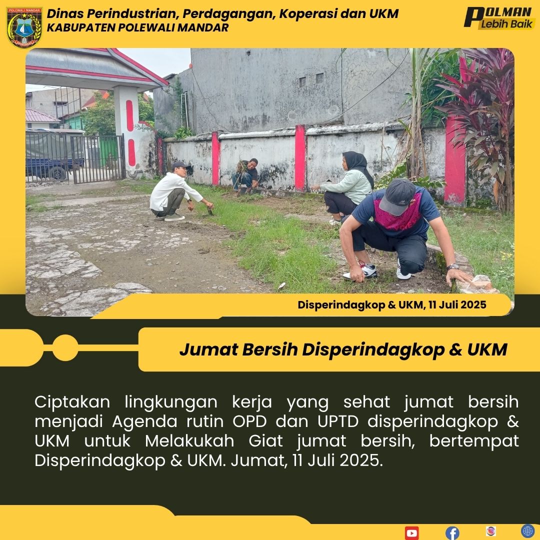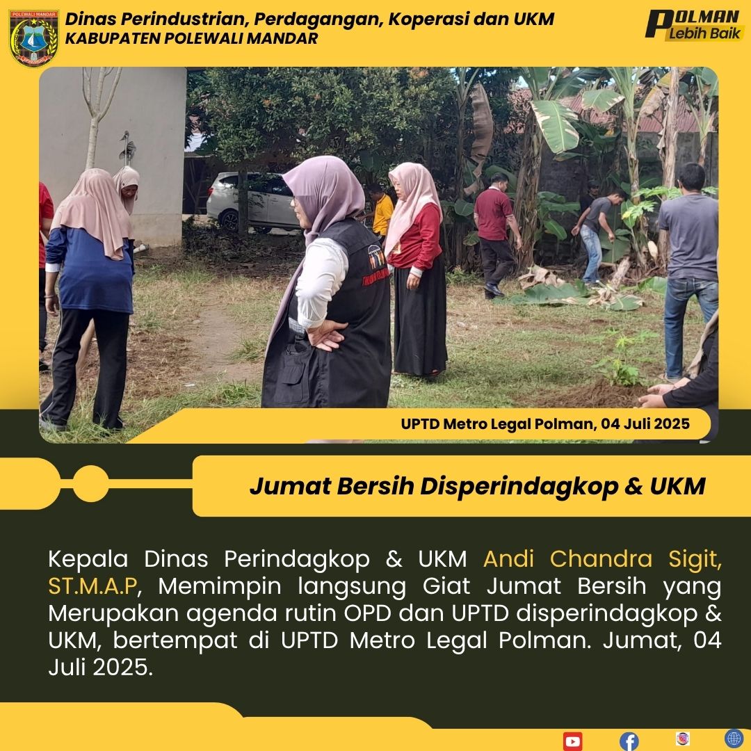 Kepala Dinas Perindagkop & UKM Andi Chandra Sigit, ST.M.A.P, Memimpin langsung Giat Jumat Bersih yang Merupakan agenda rutin OPD dan UPTD disperindagkop & UKM, bertempat di UPTD Metro Legal Polman. Jumat, 04 Juli 2025....