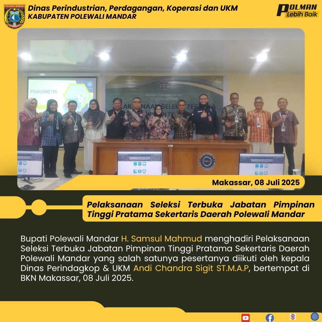 Bupati Polewali Mandar H. Samsul Mahmud menghadiri Pelaksanaan Seleksi Terbuka Jabatan Pimpinan Tinggi Pratama Sekertaris Daerah Polewali Mandar yang salah satunya pesertanya diikuti oleh kepala Dinas Perindagkop & UKM Andi Chandra Sigit ST.M.A.P, bertempat di BKN Makassar, 08 Juli 2025....