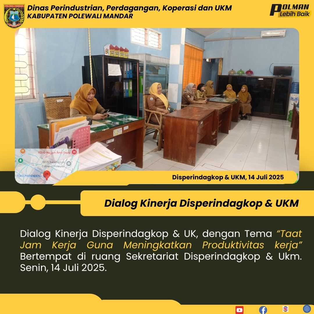 Dialog Kinerja Disperindagkop & UK, dengan Tema “Taat Jam Kerja Guna Meningkatkan Produktivitas kerja” Bertempat di ruang Sekretariat Disperindagkop & Ukm. Senin, 14 Juli 2025....