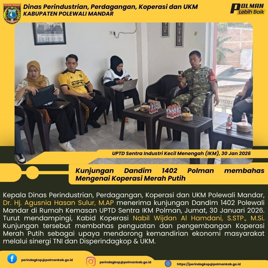 Kepala Dinas Perindustrian, Perdagangan, Koperasi dan UKM Polewali Mandar, Dr. Hj. Agusnia Hasan Sulur, M.AP menerima kunjungan Dandim 1402 Polewali Mandar di Rumah Kemasan UPTD Sentra IKM Polman, Jumat, 30 Januari 2026. Turut mendampingi, Kabid Koperasi Nabil Wijdan Al Hamdani, S.STP., M.Si. Kunjungan tersebut membahas penguatan dan pengembangan Koperasi Merah Putih sebagai upaya mendorong kemandirian ekonomi masyarakat melalui sinergi TNI dan Disperindagkop & UKM....