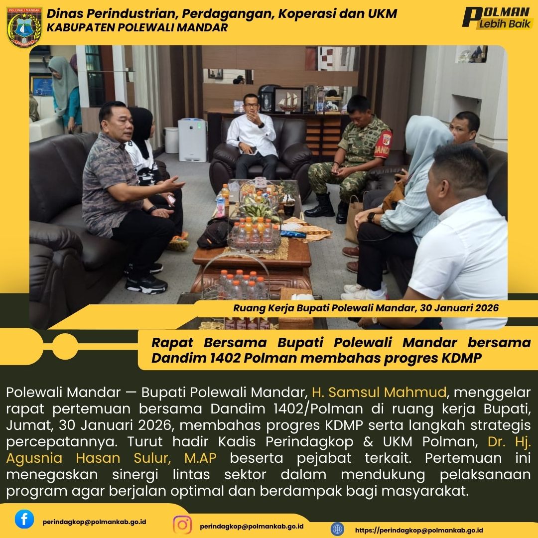 Polewali Mandar — Bupati Polewali Mandar, H. Samsul Mahmud, menggelar rapat pertemuan bersama Dandim 1402/Polman di ruang kerja Bupati, Jumat, 30 Januari 2026, membahas progres KDMP serta langkah strategis percepatannya. Turut hadir Kadis Perindagkop & UKM Polman, Dr. Hj. Agusnia Hasan Sulur, M.AP beserta pejabat terkait. Pertemuan ini menegaskan sinergi lintas sektor dalam mendukung pelaksanaan program agar berjalan optimal dan berdampak bagi masyarakat....
