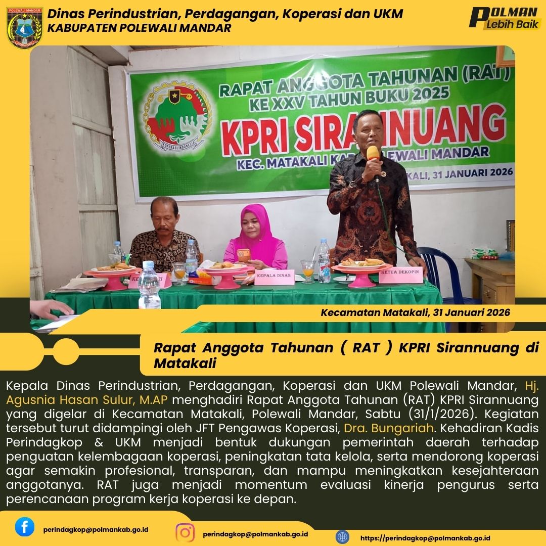 Kepala Dinas Perindustrian, Perdagangan, Koperasi dan UKM Polewali Mandar, Hj. Agusnia Hasan Sulur, M.AP menghadiri Rapat Anggota Tahunan (RAT) KPRI Sirannuang yang digelar di Kecamatan Matakali, Polewali Mandar, Sabtu (31/1/2026). Kegiatan tersebut turut didampingi oleh JFT Pengawas Koperasi, Dra. Bungariah. Kehadiran Kadis Perindagkop & UKM menjadi bentuk dukungan pemerintah daerah terhadap penguatan kelembagaan koperasi, peningkatan tata kelola, serta mendorong koperasi agar semakin profe...