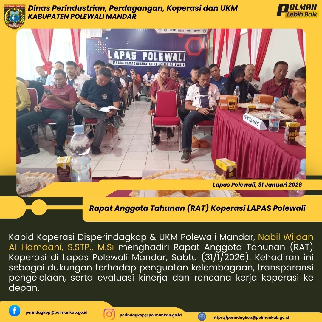 Kabid Koperasi Disperindagkop & UKM Polewali Mandar, Nabil Wijdan Al Hamdani, S.STP., M.Si menghadiri Rapat Anggota Tahunan (RAT) Koperasi di Lapas Polewali Mandar, Sabtu (31/1/2026). Kehadiran ini sebagai dukungan terhadap penguatan kelembagaan, transparansi pengelolaan, serta evaluasi kinerja dan rencana kerja koperasi ke depan....
