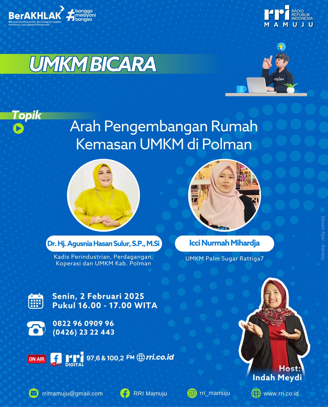 LIVE TALKSHOW “UMKM BERBICARA” Bahas Arah Pengembangan Rumah Kemasan UMKM PolmanPolewali Mandar – Dinas Perindustrian, Perdagangan, Koperasi dan UKM Kabupaten Polewali Mandar turut ambil bagian dalam Live Talkshow UMKM BERBICARA yang mengangkat topik Arah Pengembangan Rumah Kemasan UMKM di Polman. Kegiatan ini menghadirkan Hj. Agusnia Hasan Sulur, M.AP, selaku Kepala Dinas Perindagkop & UKM Kab. Polman, bersama pelaku UMKM Icci Nurmah Miharja dari UMKM Palm Sugar Rattiga7. Talkshow dip...