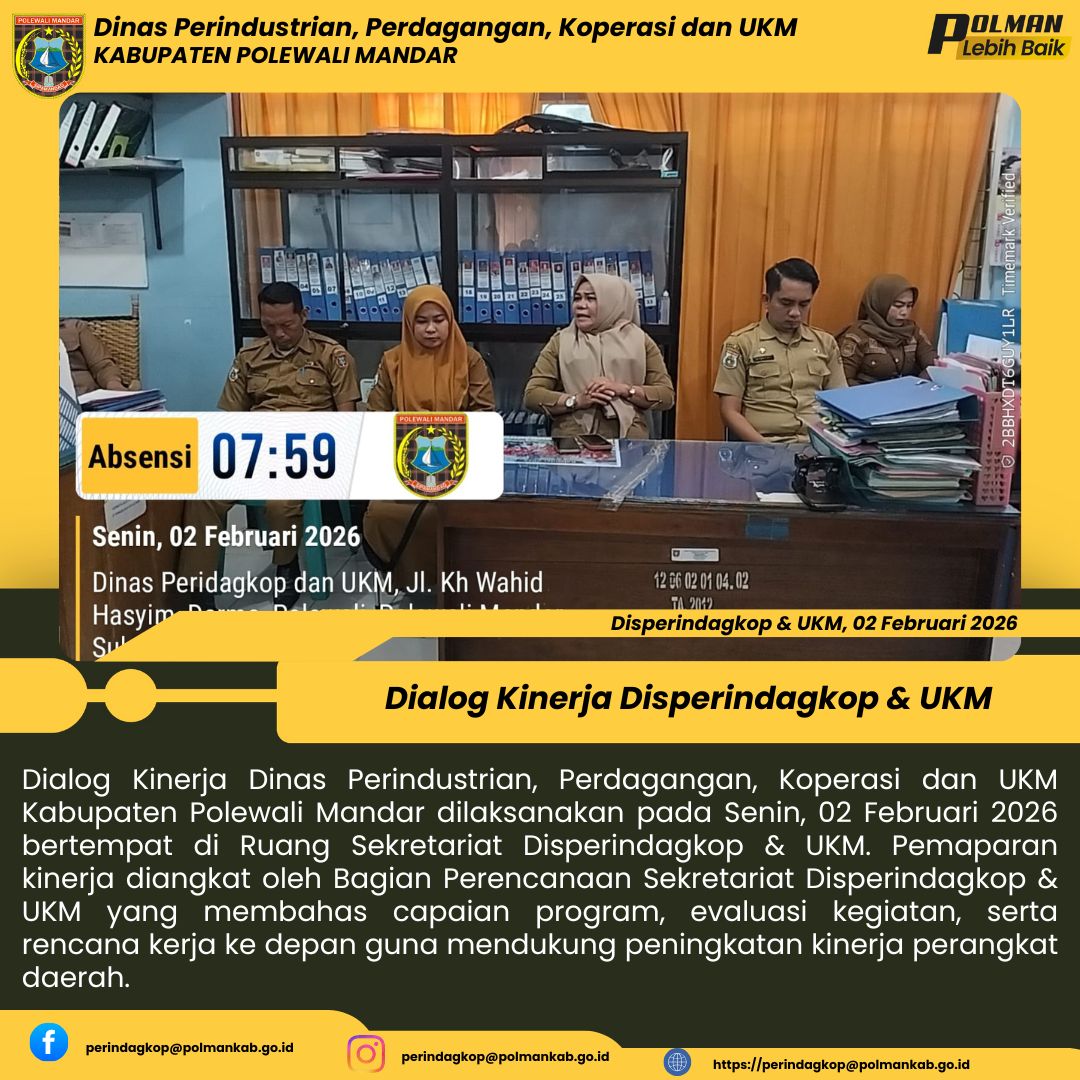 Dialog Kinerja Dinas Perindustrian, Perdagangan, Koperasi dan UKM Kabupaten Polewali Mandar dilaksanakan pada Senin, 02 Februari 2026 bertempat di Ruang Sekretariat Disperindagkop & UKM. Pemaparan kinerja diangkat oleh Bagian Perencanaan Sekretariat Disperindagkop & UKM yang membahas capaian program, evaluasi kegiatan, serta rencana kerja ke depan guna mendukung peningkatan kinerja perangkat daerah....