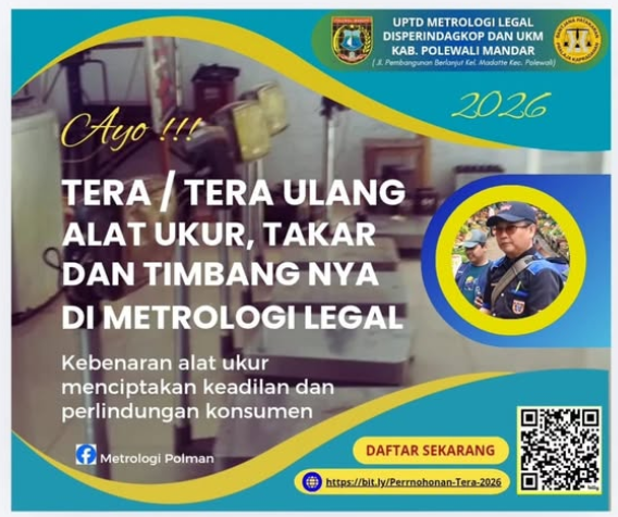UPTD Metrologi Legal melalui Kepala UPTD Ismail, ST., M.Si menghimbau seluruh masyarakat dan pelaku usaha pemilik alat ukur, takar, dan timbang berkapasitas di atas 50 kg agar segera melakukan tera atau tera ulang. Alat yang dimaksud antara lain meter kain, pompa ukur BBM SPBU, timbangan jembatan, AMP, timbangan emas elektronik, timbangan sentisimal, serta timbangan pegas kapasitas >50 kg dan sejenisnya. Tera/tera ulang penting untuk menjamin ketepatan hasil pengukuran serta mencipt...