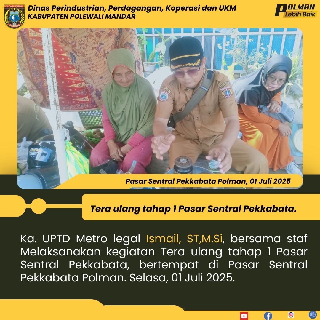 Ka. UPTD Metro legal Ismail, ST,M.Si, bersama staf Melaksanakan kegiatan Tera ulang tahap 1 Pasar Sentral Pekkabata, bertempat di Pasar Sentral Pekkabata Polman. Selasa, 01 Juli 2025....