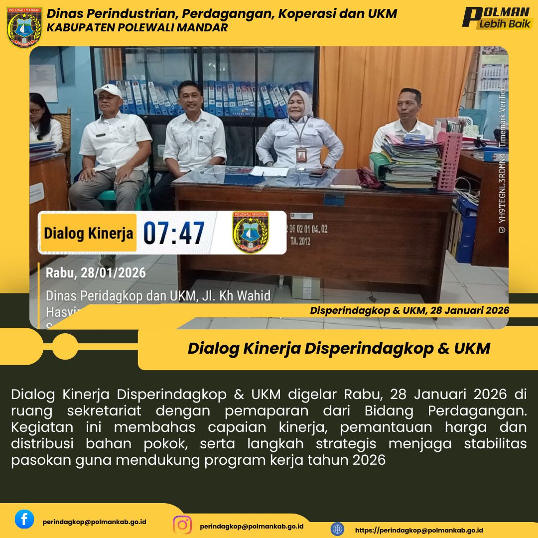 Dialog Kinerja Disperindagkop & UKM dilaksanakan pada Selasa, 27 Januari 2026, bertempat di ruang sekretariat, dengan pemaparan dari Bidang Sekretariat Bagian Kepegawaian. Kegiatan ini membahas capaian kinerja, pengelolaan administrasi kepegawaian, serta langkah strategis dalam meningkatkan disiplin dan profesionalisme aparatur guna mendukung kelancaran program kerja tahun 2026....