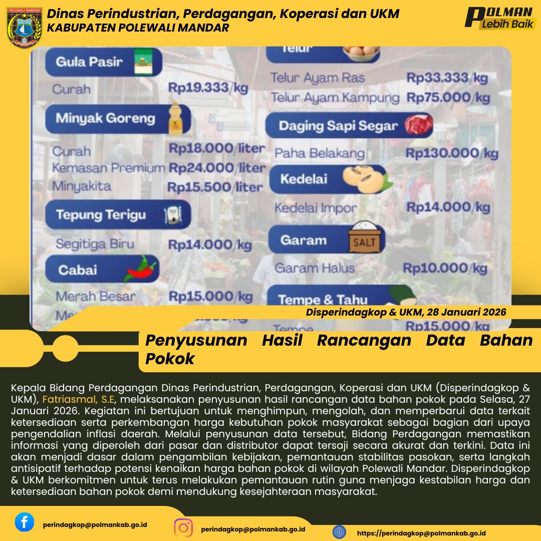 Kepala Bidang Perdagangan Dinas Perindustrian, Perdagangan, Koperasi dan UKM (Disperindagkop & UKM), Fatriasmal, S.E, melaksanakan penyusunan hasil rancangan data bahan pokok pada Selasa, 27 Januari 2026. Kegiatan ini bertujuan untuk menghimpun, mengolah, dan memperbarui data terkait ketersediaan serta perkembangan harga kebutuhan pokok masyarakat sebagai bagian dari upaya pengendalian inflasi daerah. Melalui penyusunan data tersebut, Bidang Perdagangan memastikan informasi yang diperoleh da...