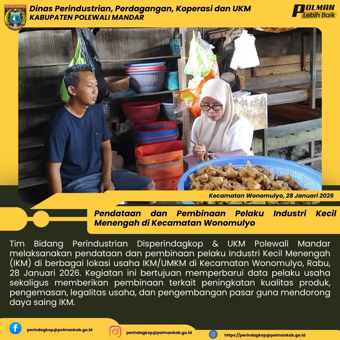 Tim Bidang Perindustrian Disperindagkop & UKM Polewali Mandar melaksanakan pendataan dan pembinaan pelaku Industri Kecil Menengah (IKM) di berbagai lokasi usaha IKM/UMKM di Kecamatan Wonomulyo, Rabu, 28 Januari 2026. Kegiatan ini bertujuan memperbarui data pelaku usaha sekaligus memberikan pembinaan terkait peningkatan kualitas produk, pengemasan, legalitas usaha, dan pengembangan pasar guna mendorong daya saing IKM....