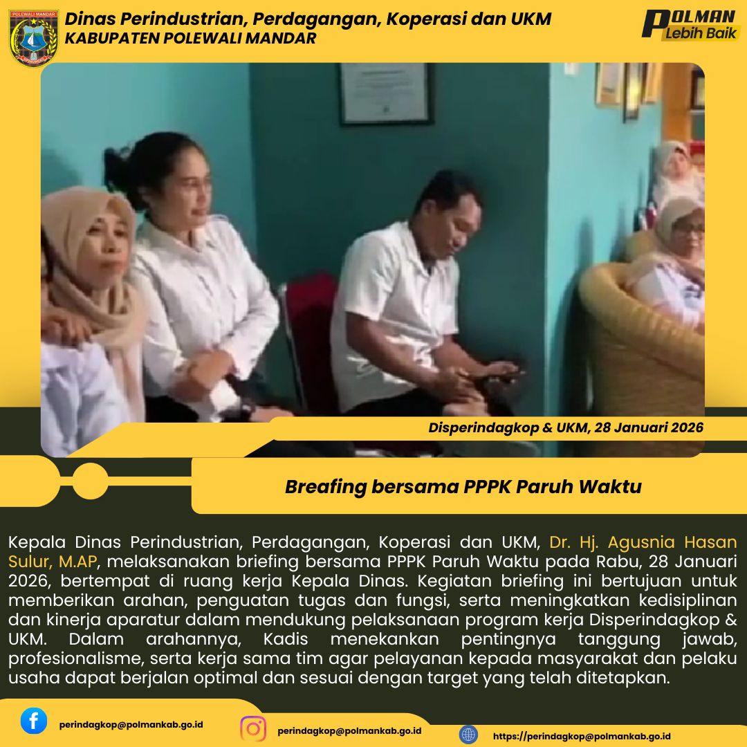 Kepala Dinas Perindustrian, Perdagangan, Koperasi dan UKM, Dr. Hj. Agusnia Hasan Sulur, M.AP, melaksanakan briefing bersama PPPK Paruh Waktu pada Rabu, 28 Januari 2026, bertempat di ruang kerja Kepala Dinas. Kegiatan briefing ini bertujuan untuk memberikan arahan, penguatan tugas dan fungsi, serta meningkatkan kedisiplinan dan kinerja aparatur dalam mendukung pelaksanaan program kerja Disperindagkop & UKM. Dalam arahannya, Kadis menekankan pentingnya tanggung jawab, profesionalisme, serta ke...