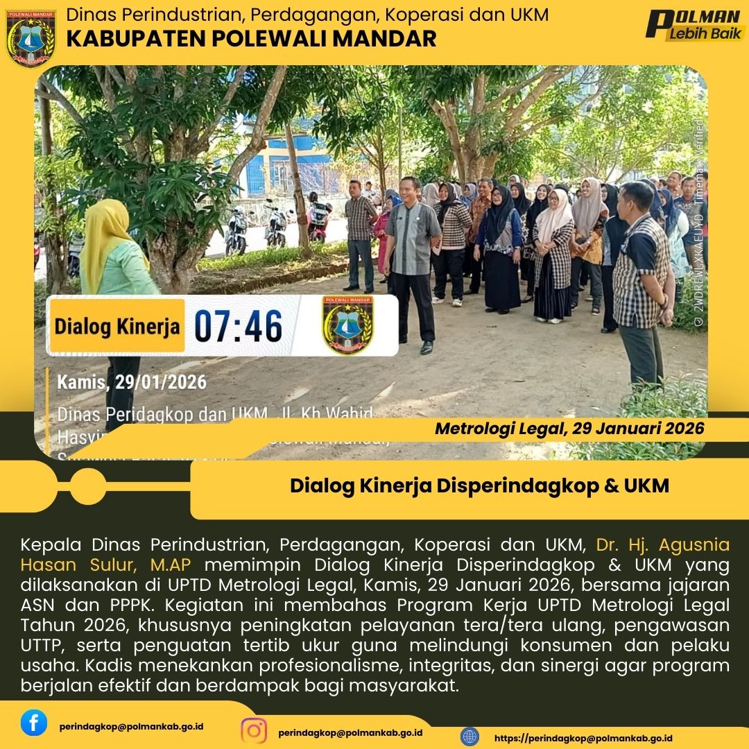 Kepala Dinas Perindustrian, Perdagangan, Koperasi dan UKM, Dr. Hj. Agusnia Hasan Sulur, M.AP memimpin Dialog Kinerja Disperindagkop & UKM yang dilaksanakan di UPTD Metrologi Legal, Kamis, 29 Januari 2026, bersama jajaran ASN dan PPPK. Kegiatan ini membahas Program Kerja UPTD Metrologi Legal Tahun 2026, khususnya peningkatan pelayanan tera/tera ulang, pengawasan UTTP, serta penguatan tertib ukur guna melindungi konsumen dan pelaku usaha. Kadis menekankan profesionalisme, integritas, dan siner...