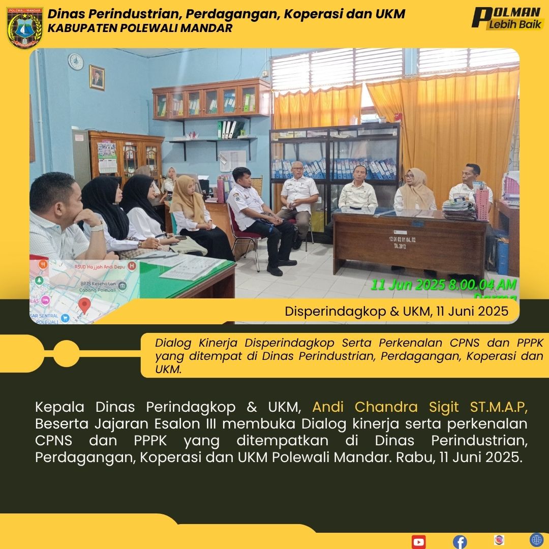 Kepala Dinas Perindagkop & UKM, Andi Chandra Sigit ST.M.A.P, Beserta Jajaran Esalon III membuka Dialog kinerja serta perkenalan CPNS dan PPPK yang ditempatkan di Dinas Perindustrian, Perdagangan, Koperasi dan UKM Polewali Mandar. Rabu, 11 Juni 2025....