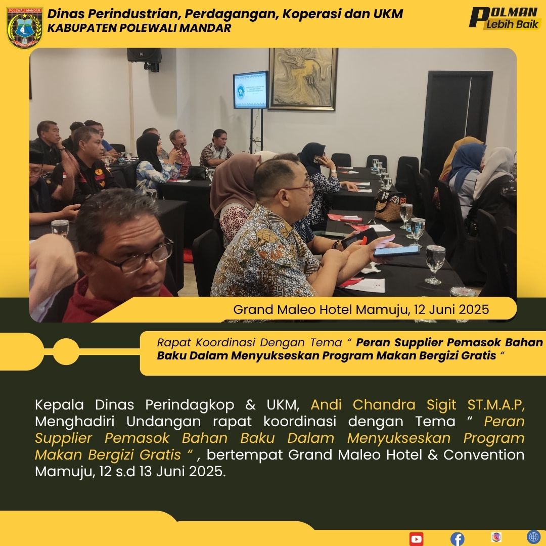 Kepala Dinas Perindagkop & UKM, Andi Chandra Sigit ST.M.A.P, Menghadiri Undangan rapat koordinasi dengan Tema “ Peran Supplier Pemasok Bahan Baku Dalam Menyukseskan Program Makan Bergizi Gratis “ , bertempat Grand Maleo Hotel & Convention Mamuju, 12 s.d 13 Juni 2025....