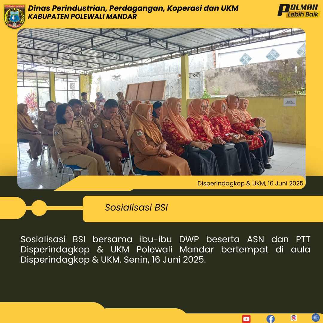 Sosialisasi BSI bersama ibu-ibu DWP beserta ASN dan PTT Disperindagkop & UKM Polewali Mandar bertempat di aula Disperindagkop & UKM. Senin, 16 Juni 2025....