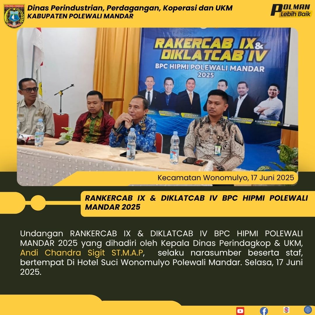 Undangan RANKERCAB IX & DIKLATCAB IV BPC HIPMI POLEWALI MANDAR 2025 yang dihadiri oleh Kepala Dinas Perindagkop & UKM, Andi Chandra Sigit ST.M.A.P, selaku narasumber beserta staf, bertempat Di Hotel Suci Wonomulyo Polewali Mandar. Selasa, 17 Juni 2025....