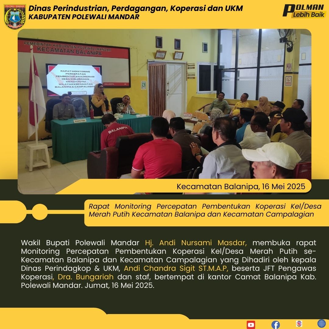Wakil Bupati Polewali Mandar Hj. Andi Nursami Masdar, membuka rapat Monitoring Percepatan Pembentukan Koperasi Kel/Desa Merah Putih se-Kecamatan Balanipa dan Kecamatan Campalagian yang Dihadiri oleh kepala Dinas Perindagkop & UKM, Andi Chandra Sigit ST.M.A.P, beserta JFT Pengawas Koperasi, Dra. Bungariah dan staf, bertempat di kantor Camat Balanipa Kab. Polewali Mandar. Jumat, 16 Mei 2025....