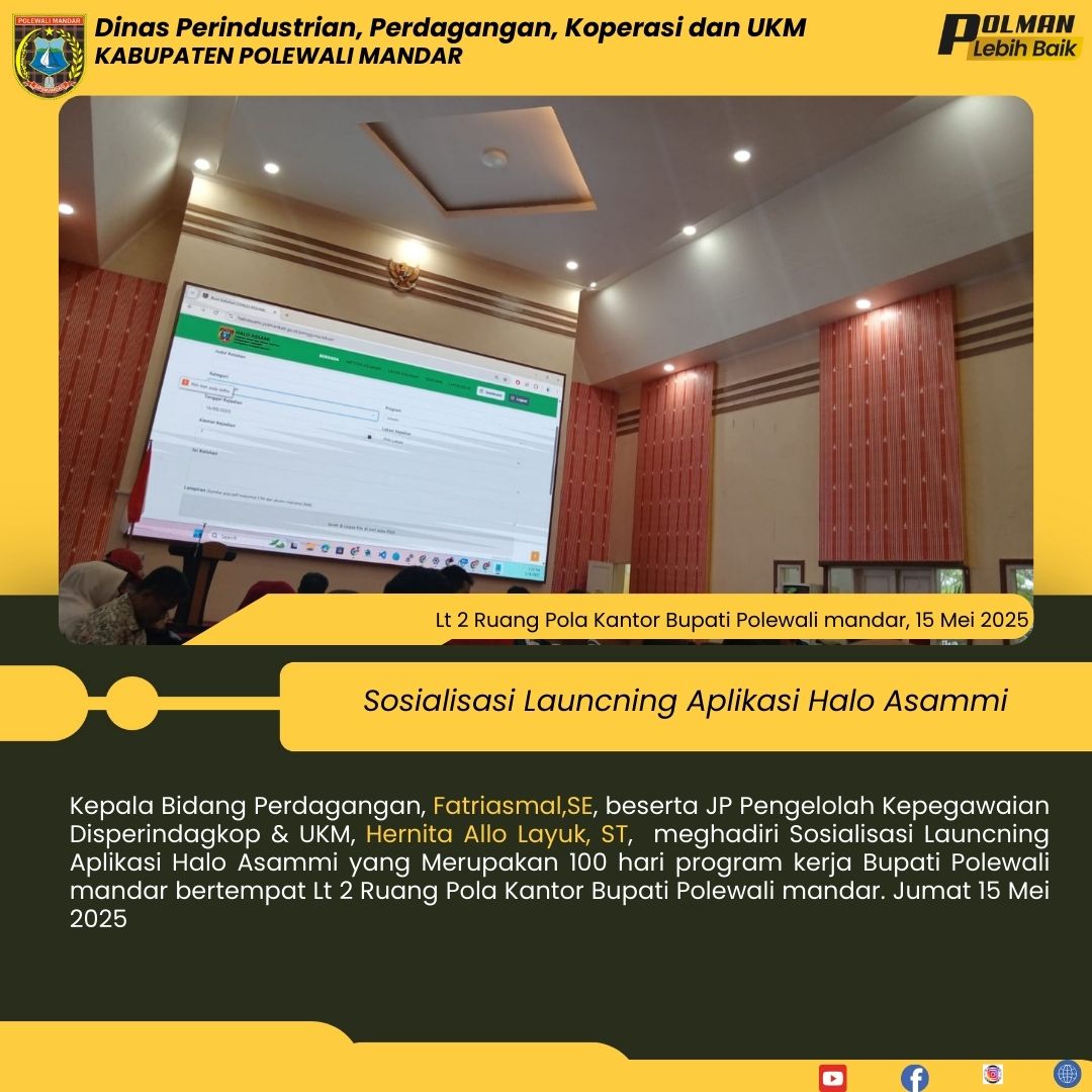 Kepala Bidang Perdagangan, Fatriasmal,SE, beserta JP Pengelolah Kepegawaian Disperindagkop & UKM, Hernita Allo Layuk, ST, meghadiri Sosialisasi Launcning Aplikasi Halo Asammi yang Merupakan 100 hari program kerja Bupati Polewali mandar bertempat Lt 2 Ruang Pola Kantor Bupati Polewali mandar. Jumat 15 Mei 2025....