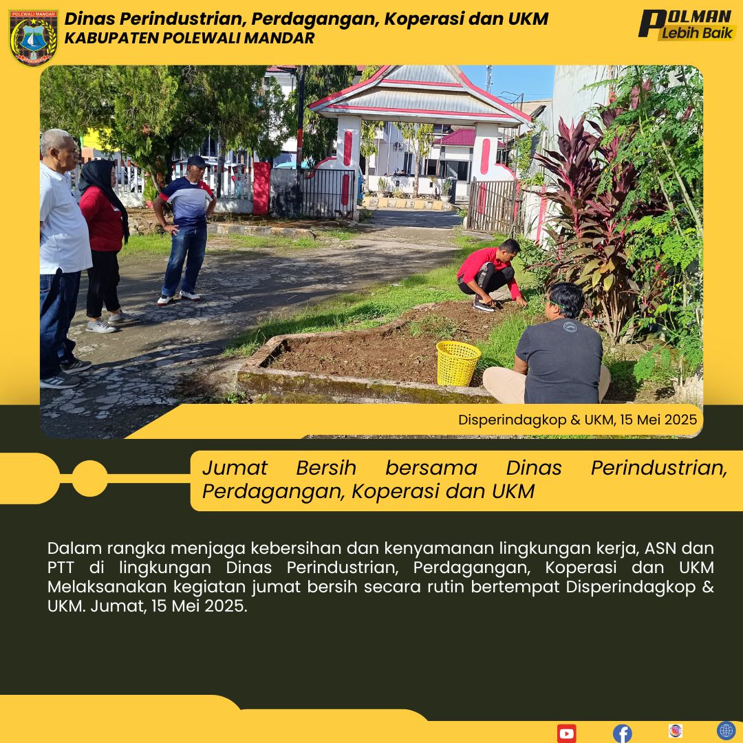 Dalam rangka menjaga kebersihan dan kenyamanan lingkungan kerja, ASN dan PTT di lingkungan Dinas Perindustrian, Perdagangan, Koperasi dan UKM Melaksanakan kegiatan jumat bersih secara rutin bertempat Disperindagkop & UKM. Jumat, 15 Mei 2025....