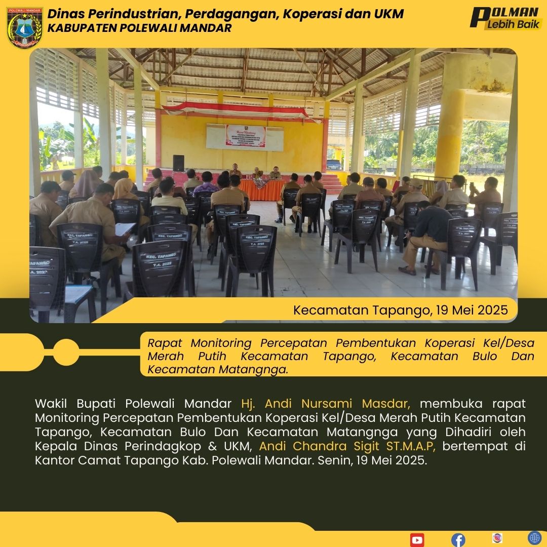 Wakil Bupati Polewali Mandar Hj. Andi Nursami Masdar, membuka rapat Monitoring Percepatan Pembentukan Koperasi Kel/Desa Merah Putih Kecamatan Tapango, Kecamatan Bulo Dan Kecamatan Matangnga yang Dihadiri oleh Kepala Dinas Perindagkop & UKM, Andi Chandra Sigit ST.M.A.P, bertempat di Kantor Camat Tapango Kab. Polewali Mandar. Senin, 19 Mei 2025....