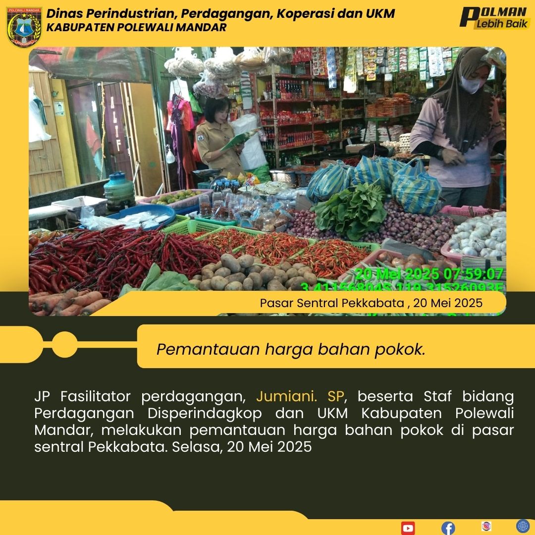 JP Fasilitator perdagangan, Jumiani. SP, beserta Staf bidang Perdagangan Disperindagkop dan UKM Kabupaten Polewali Mandar, melakukan pemantauan harga bahan pokok di pasar sentral Pekkabata. Selasa, 20 Mei 2025...