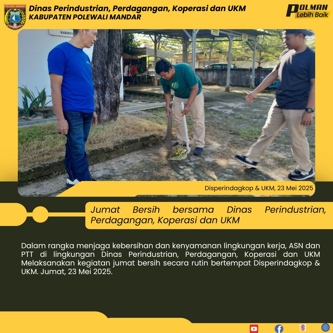 Dalam rangka menjaga kebersihan dan kenyamanan lingkungan kerja, ASN dan PTT di lingkungan Dinas Perindustrian, Perdagangan, Koperasi dan UKM Melaksanakan kegiatan jumat bersih secara rutin bertempat Disperindagkop & UKM. Jumat, 23 Mei 2025....