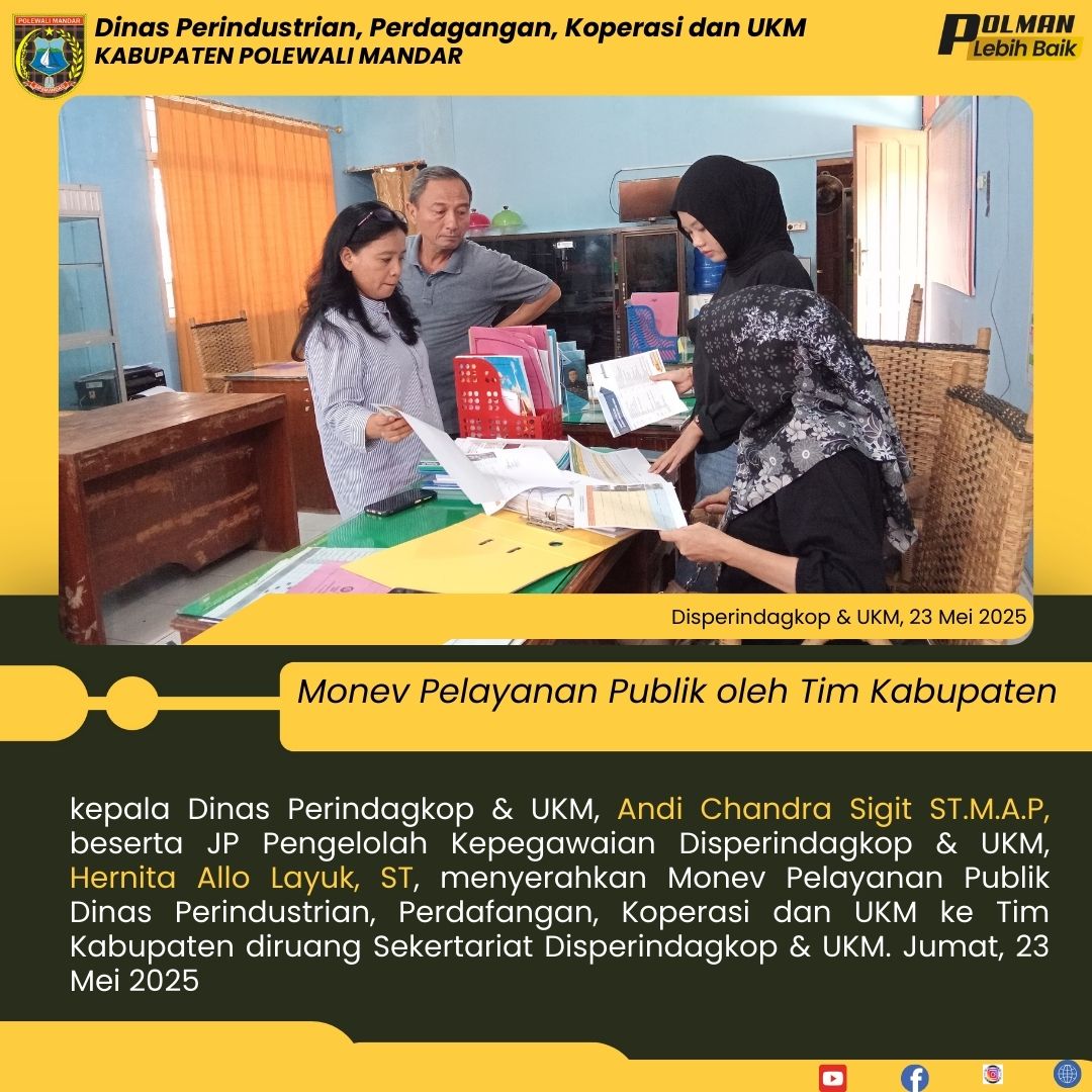 kepala Dinas Perindagkop & UKM, Andi Chandra Sigit ST.M.A.P, beserta JP Pengelolah Kepegawaian Disperindagkop & UKM, Hernita Allo Layuk, ST, menyerahkan Monev Pelayanan Publik Dinas Perindustrian, Perdafangan, Koperasi dan UKM ke Tim Kabupaten diruang Sekertariat Disperindagkop & UKM. Jumat, 23 Mei 2025...