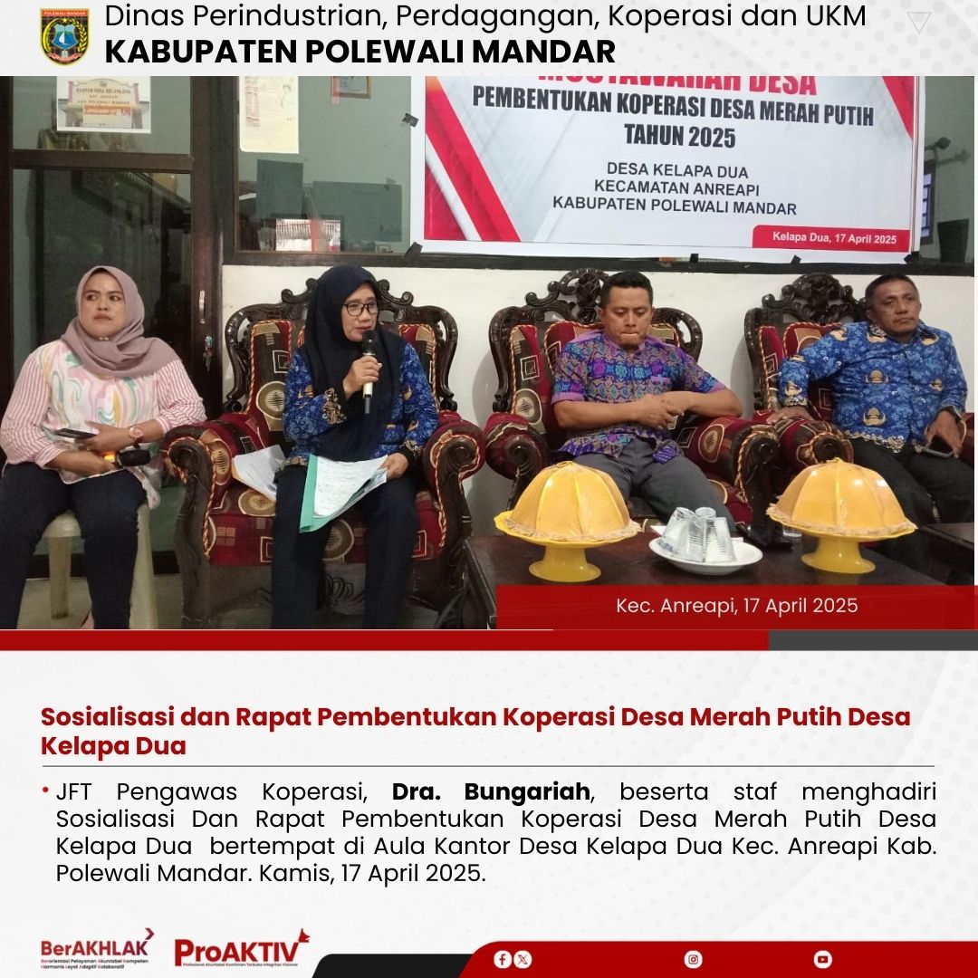 JFT Pengawas Koperasi, Dra. Bungariah, beserta staf menghadiri Sosialisasi Dan Rapat Pembentukan Koperasi Desa Merah Putih Desa Kelapa Dua bertempat di Aula Kantor Desa Kelapa Dua Kec. Anreapi Kab. Polewali Mandar. Kamis, 17 April 2025....