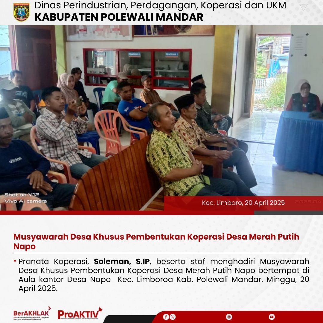Pranata Koperasi, Soleman, S.IP, beserta staf menghadiri Musyawarah Desa Khusus Pembentukan Koperasi Desa Merah Putih Napo bertempat di Aula kantor Desa Napo Kec. Limboroa Kab. Polewali Mandar. Minggu, 20 April 2025....