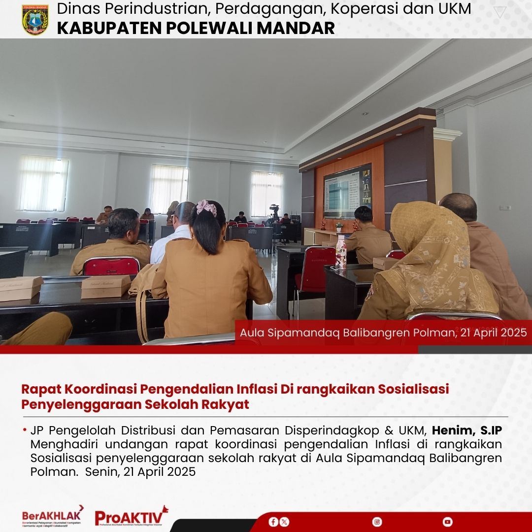 JP Pengelolah Distribusi dan Pemasaran Disperindagkop & UKM, Henim, S.IP Menghadiri undangan rapat koordinasi pengendalian Inflasi di rangkaikan Sosialisasi penyelenggaraan sekolah rakyat di Aula Sipamandaq Balibangren Polman. Senin, 21 April 2025...