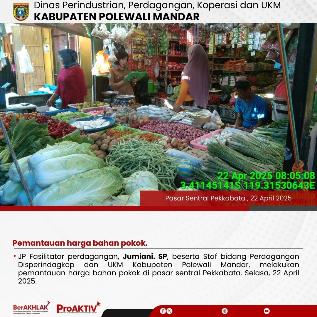 JP Fasilitator perdagangan, Jumiani. SP, beserta Staf bidang Perdagangan Disperindagkop dan UKM Kabupaten Polewali Mandar, melakukan pemantauan harga bahan pokok di pasar sentral Pekkabata. Selasa, 22 April 2025....