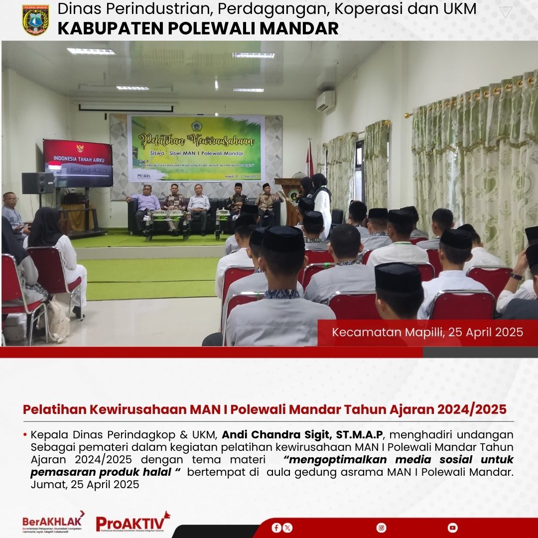 Kepala Dinas Perindagkop & UKM, Andi Chandra Sigit, ST.M.A.P, menghadiri undangan Sebagai pemateri dalam kegiatan pelatihan kewirusahaan MAN I Polewali Mandar Tahun Ajaran 2024/2025 dengan tema materi “mengoptimalkan media sosial untuk pemasaran produk halal “ bertempat di aula gedung asrama MAN I Polewali Mandar. Jumat, 25 April 2025...
