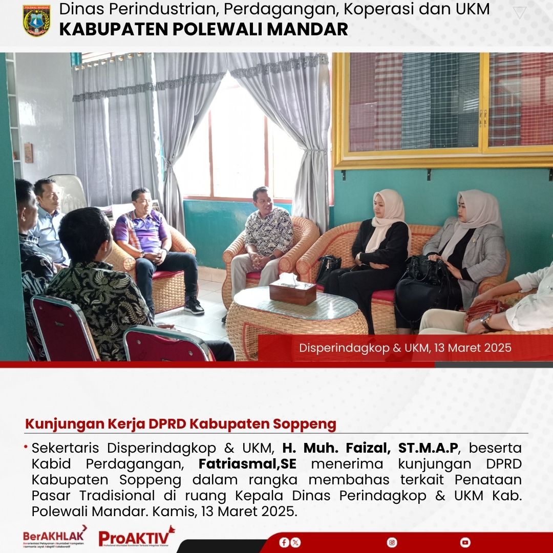 Sekertaris Disperindagkop & UKM, H. Muh. Faizal, ST.M.A.P, beserta Kabid Perdagangan, Fatriasmal,SE menerima kunjungan DPRD Kabupaten Soppeng dalam rangka membahas terkait Penataan Pasar Tradisional di ruang Kepala Dinas Perindagkop & UKM Kab. Polewali Mandar. Kamis, 13 Maret 2025....