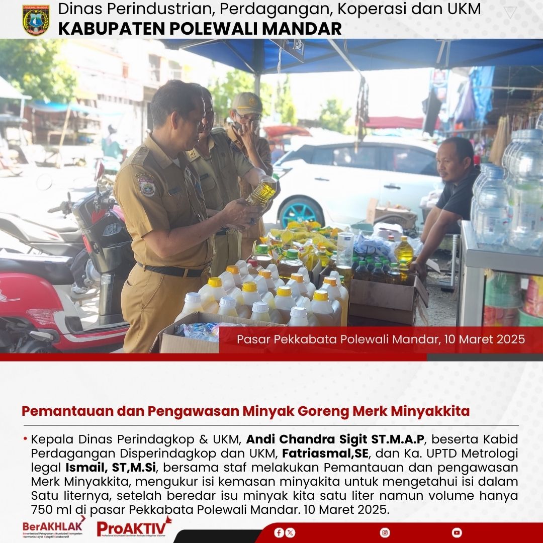 Kepala Dinas Perindagkop & UKM, Andi Chandra Sigit ST.M.A.P, beserta Kabid Perdagangan Disperindagkop dan UKM, Fatriasmal,SE, dan Ka. UPTD Metrologi legal Ismail, ST,M.Si, bersama staf melakukan Pemantauan dan pengawasan Merk Minyakkita, mengukur isi kemasan minyakita untuk mengetahui isi dalam Satu liternya, setelah beredar isu minyak kita satu liter namun volume hanya 750 ml di pasar Pekkabata Polewali Mandar. Senin, 10 Maret 2025....