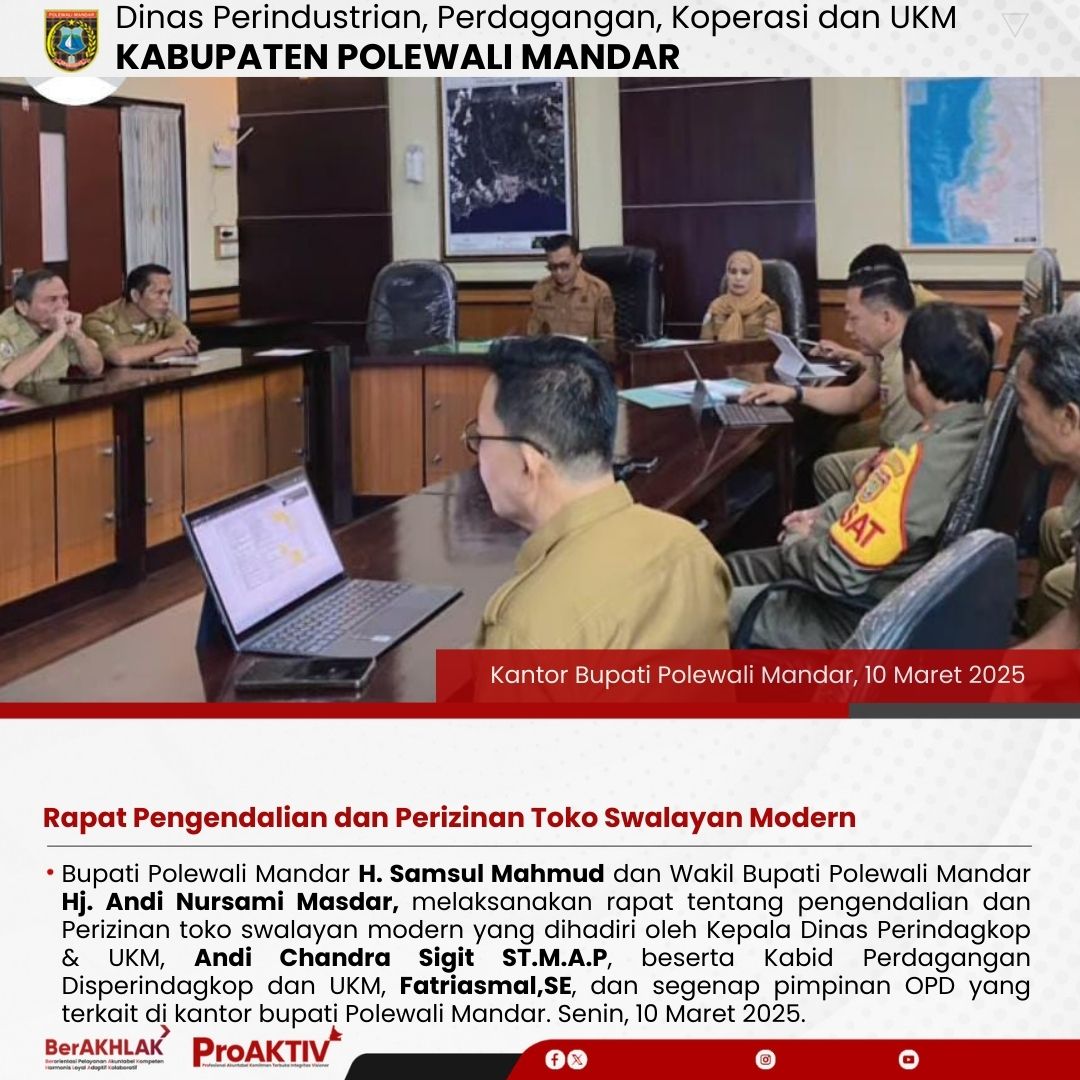 Bupati Polewali Mandar H. Samsul Mahmud dan Wakil Bupati Polewali Mandar Hj. Andi Nursami Masdar, melaksanakan rapat tentang pengendalian dan Perizinan toko swalayan modern yang dihadiri oleh Kepala Dinas Perindagkop & UKM, Andi Chandra Sigit ST.M.A.P, beserta Kabid Perdagangan Disperindagkop dan UKM, Fatriasmal,SE, dan segenap pimpinan OPD yang terkait di kantor bupati Polewali Mandar. Senin, 10 Maret 2025....