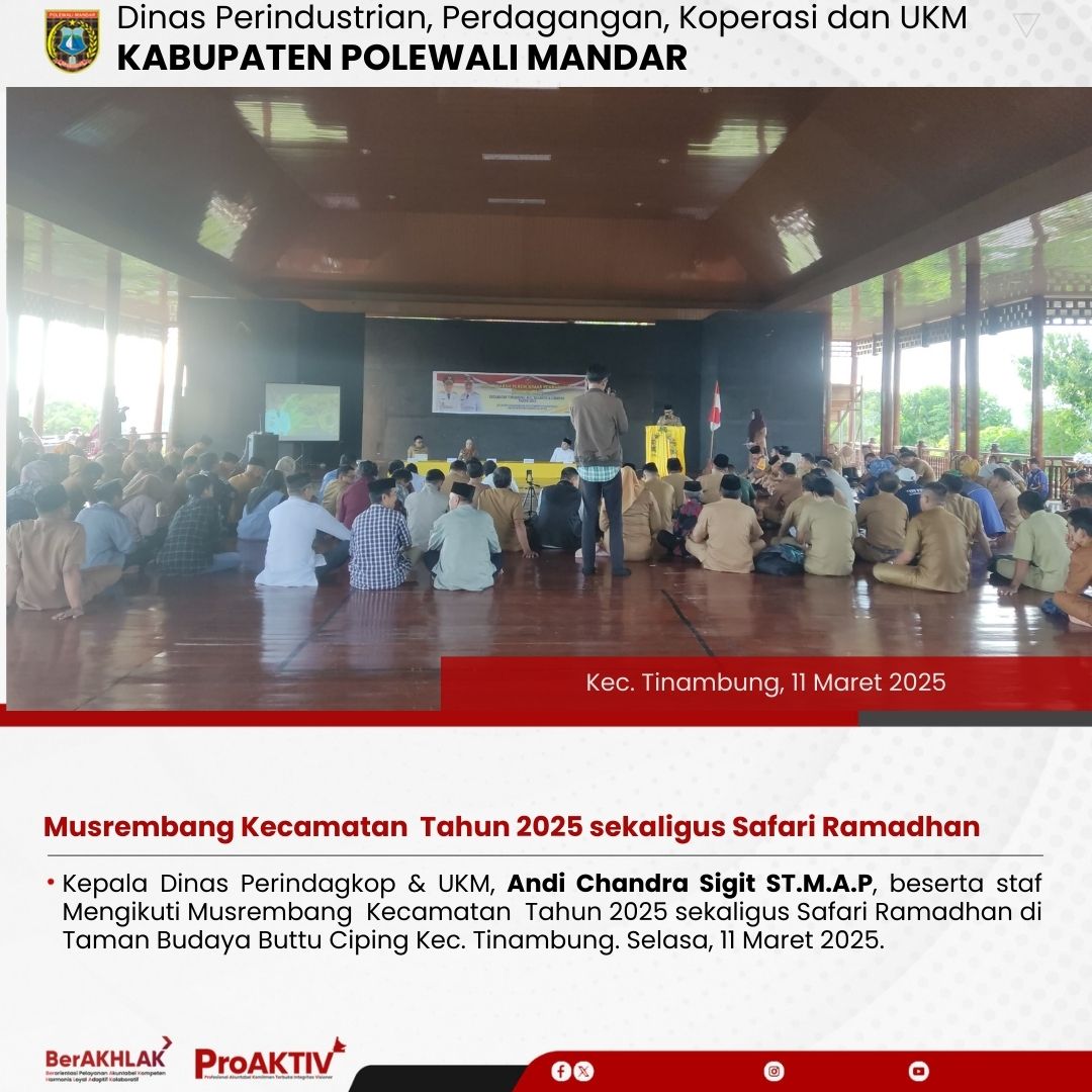 Kepala Dinas Perindagkop & UKM, Andi Chandra Sigit ST.M.A.P, beserta staf Mengikuti Musrembang Kecamatan Tahun 2025 sekaligus Safari Ramadhan di Taman Budaya Buttu Ciping Kec. Tinambung. Selasa, 11 Maret 2025....