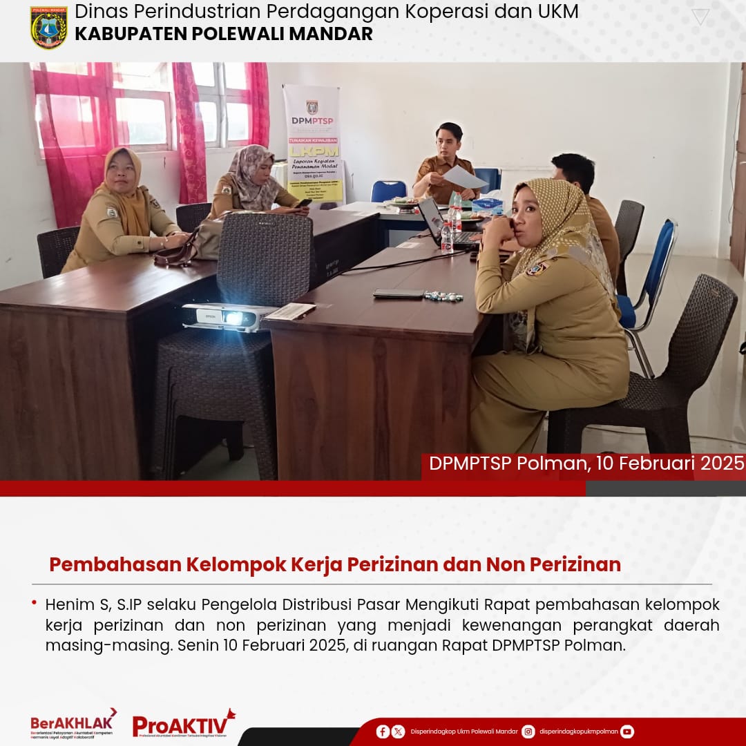 HENIM, S.SIP, selaku Pengelola Distribusi Pasar mengikuti rapat pembahasan kelompok kerja perizinan dan non perizinan yang menjadi kewenangan perangkat daerah masing-masing di Ruang Rapat DPMPTSP Polman pada hari Senin, 10 Februari 2025...