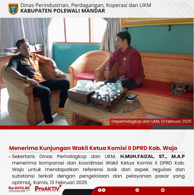 Sekretaris Dinas Perindustrian, perdagangan, Koperasi dan UKM, H.MUH.FAIZAL, ST., M.A.P, menerima komparasi dan koordinasi Wakil Ketua Komisi II DPRD Kabupaten Wajo, Sulawesi Selatan untuk mendapatkan referensi baik dari aspek regulasi dan substansi terkait dengan pengelolaan dan pelayanan pasar yang optimal. Kamis, 13 Februari 2025...