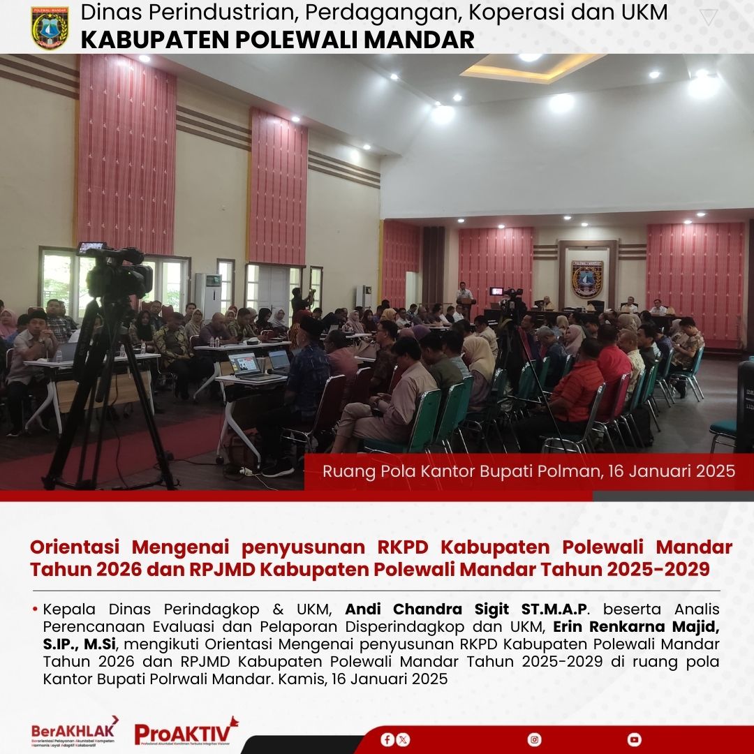Kepala Dinas Perindagkop & UKM, Andi Chandra Sigit ST.M.A.P. beserta Analis Perencanaan Evaluasi dan Pelaporan Disperindagkop dan UKM, Erin Renkarna Majid, S.IP., M.Si, mengikuti Orientasi Mengenai penyusunan RKPD Kabupaten Polewali Mandar Tahun 2026 dan RPJMD Kabupaten Polewali Mandar Tahun 2025-2029 di ruang pola Kantor Bupati Polrwali Mandar. Kamis, 16 Januari 2025. ...